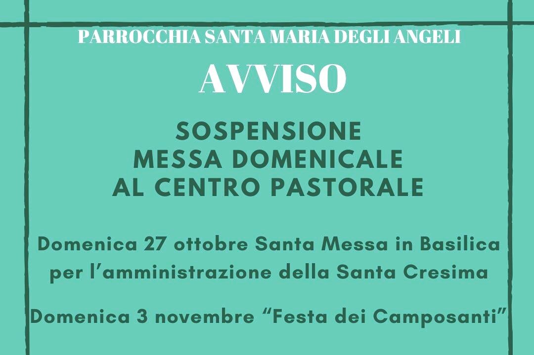 La santa Messa domenicale del Centro Pastorale è sospesa per favorire la partecipazione all’amministrazione della Cresima di domenica 27 ottobre e alla “Festa dei Camposanti” di domenica 3 novembre. Riprenderà regolarmente