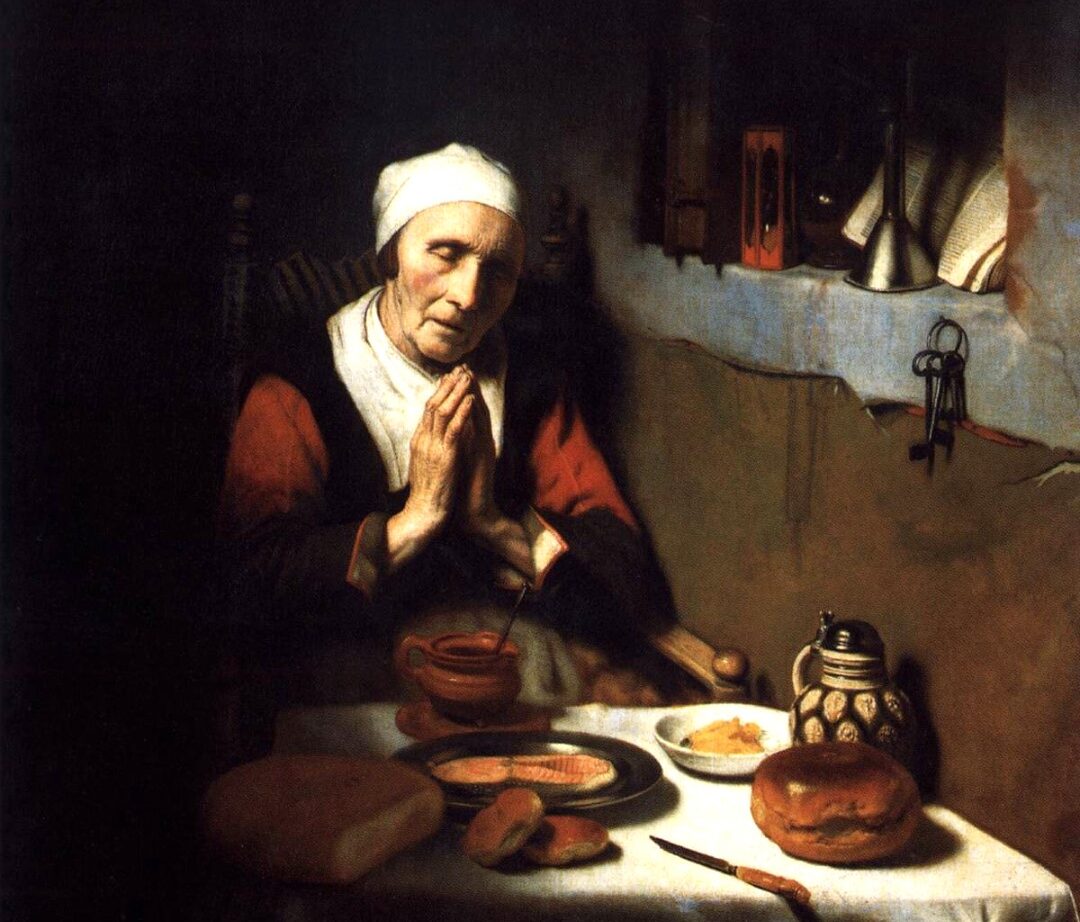 Un gatto scaltro e indisponente, cerca di disturbare la quiete imperturbabile della preghiera di questa anziana signora davanti al suo povero pasto. Non si tratta di un affaccio sul tema