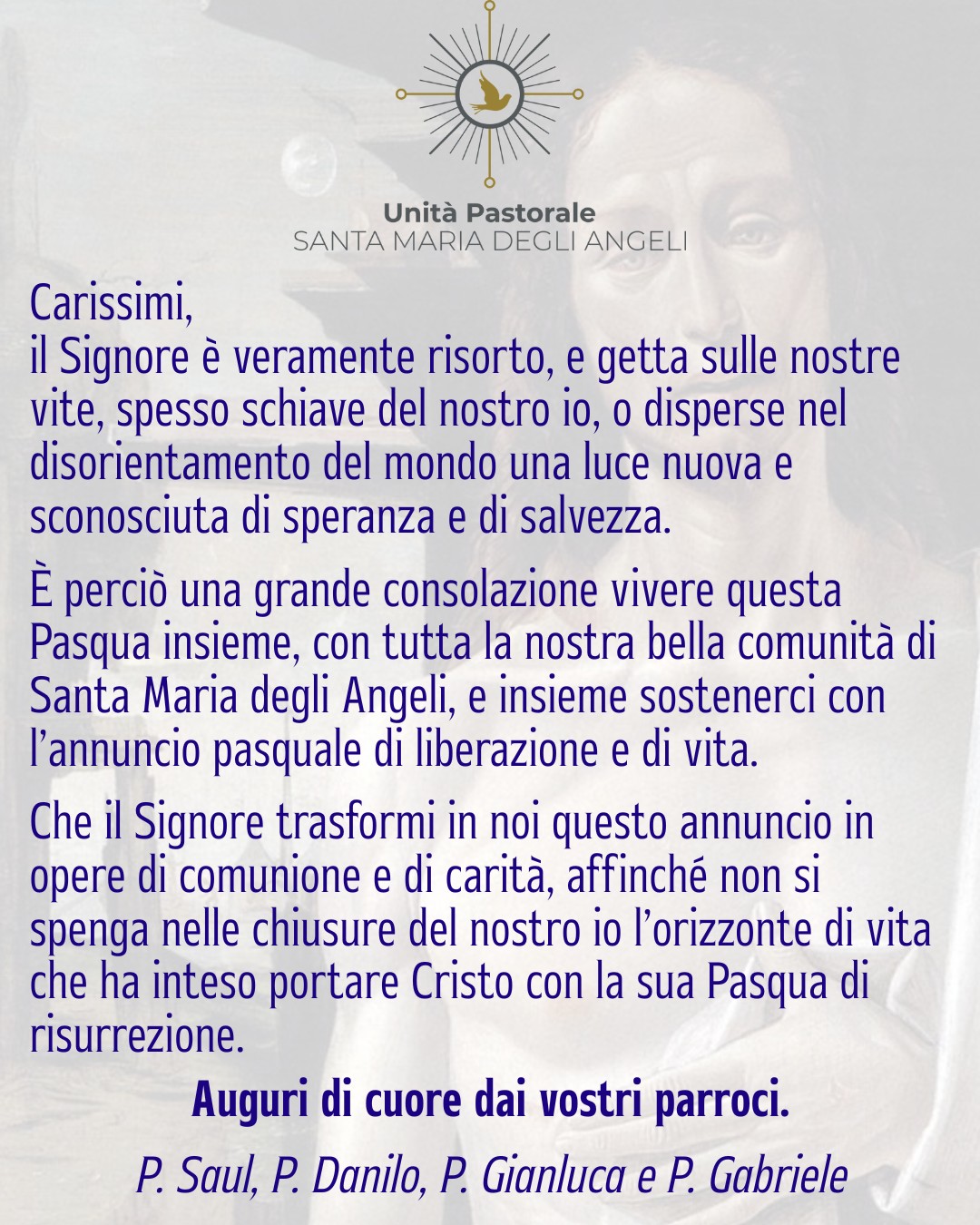 È perciò una grande consolazione vivere questa Pasqua insieme, con tutta la nostra bella comunità di Santa Maria degli Angeli, e insieme sostenerci con l’annuncio pasquale di liberazione e di vita.