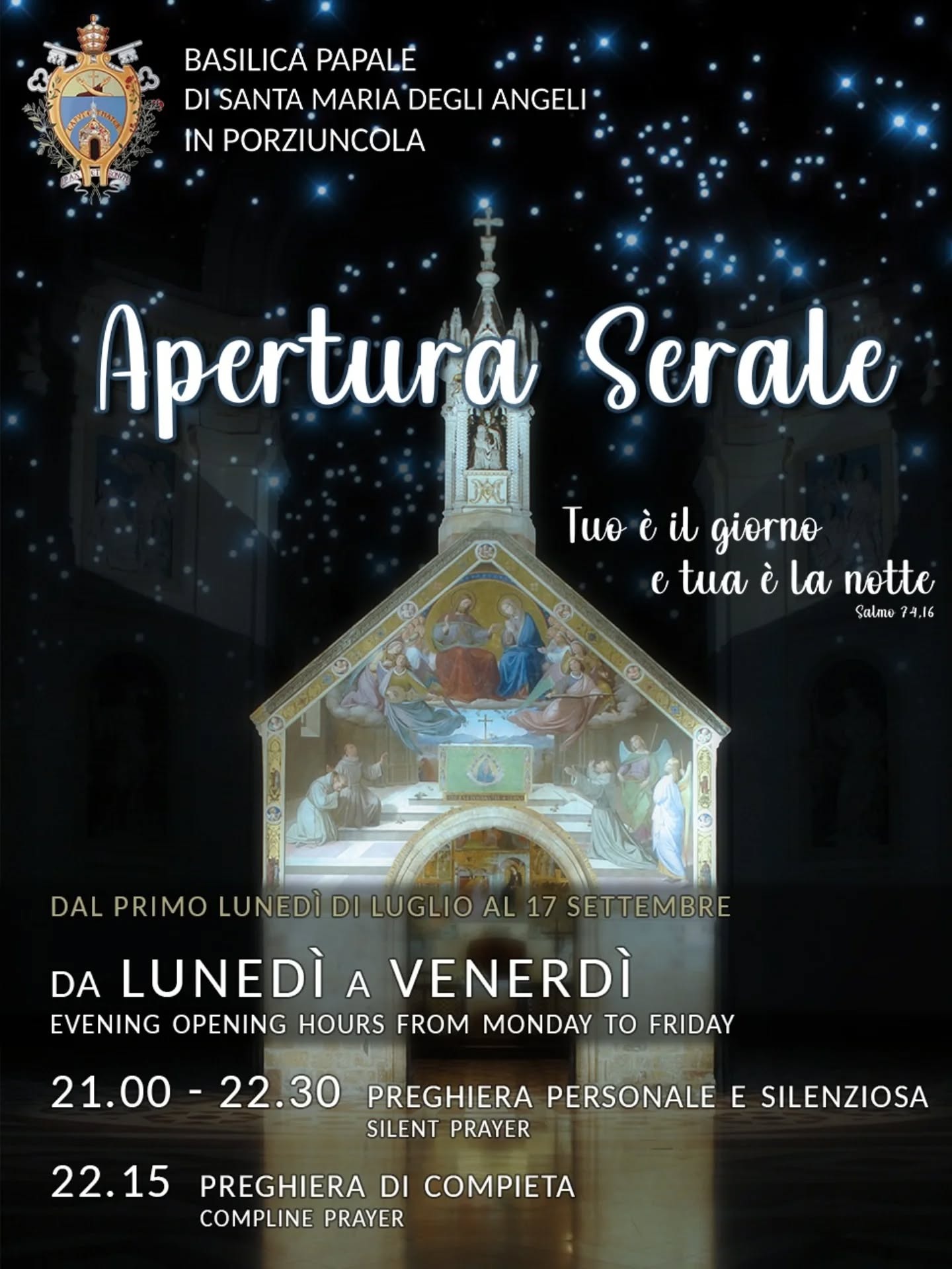 Siamo felici di annunciarvi che, a partire da lunedì 7 luglio e fino al 17 settembre 2025, la Basilica di Santa Maria degli Angeli sarà aperta anche la sera!