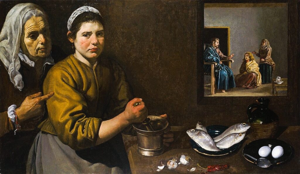 L’opera del grande Velázquez, dunque, è un’interpretazione quasi esegetica del richiamo evangelico in senso apparentemente opposto di quella immediata. La donna in primo piano è evidentemente impegnata suo malgrado in compiti servili, ma una signora la soccorre con il senso di ciò che sta compiendo e per questo rievocando un episodio, proprio quello avvenuto nella casa di Betania, attraverso una sorta di slide ante litteram sulla loro sinistra, in quello che potrebbe essere un quadro, oppure uno specchio o una finestra. Il grande artista andaluso ci vuole dire, raccogliendo la raccomandazione di Santa Teresa d’Avila, che non ci sono stati di vita che ci precludono la comunione con Dio, mentre è necessaria la disposizione di Maria anche nei compiti più umili. Del resto, questa stupenda natura morta sul tavolo della serva non è un’evidente evocazione del fatto che il Signore ha voluto far passare la comunione con lui attraverso la ritualità di una mensa?
