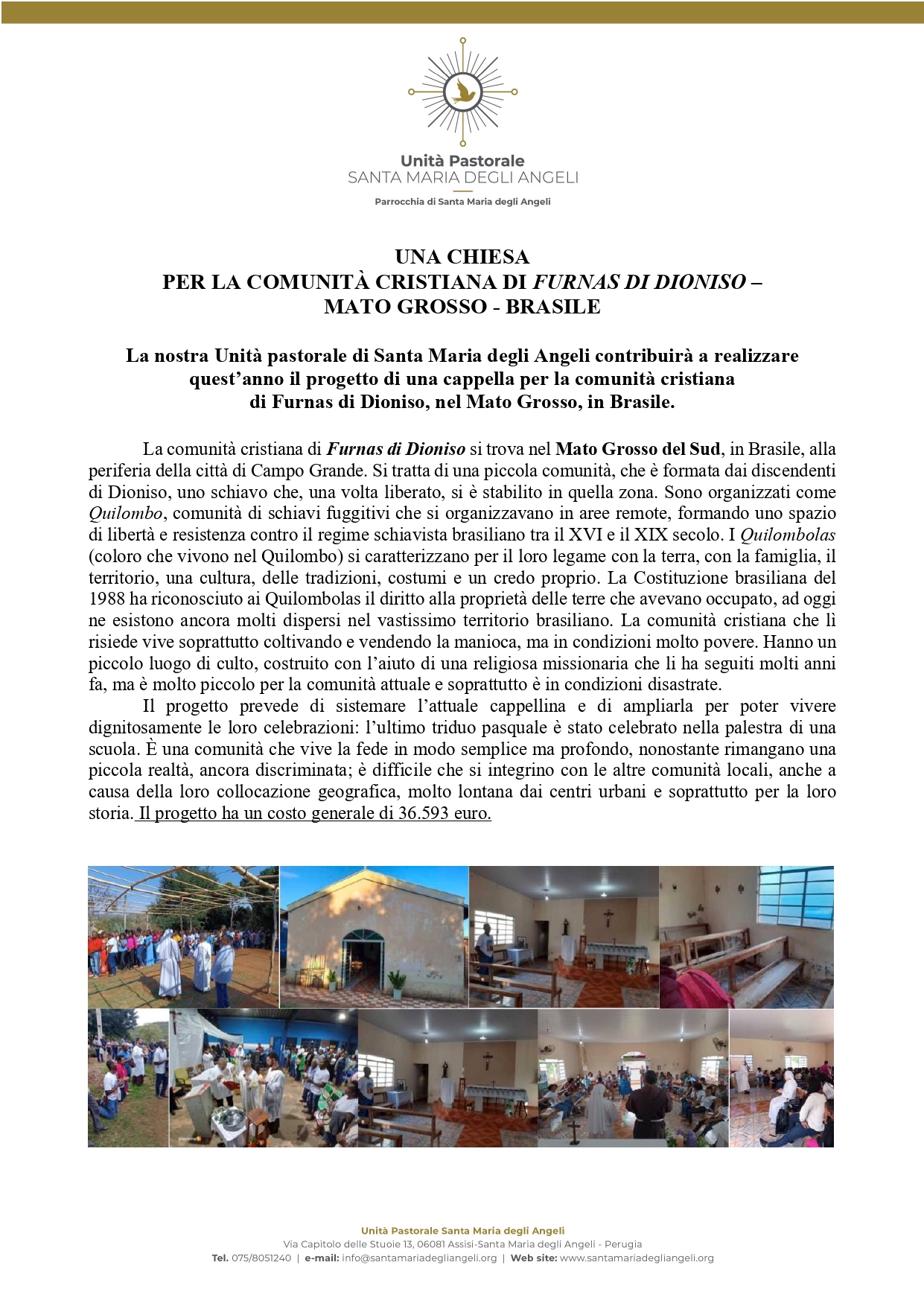 La nostra Unità pastorale di Santa Maria degli Angeli contribuirà a realizzare quest’anno il progetto di una cappella per la comunità cristiana di Furnas di Dioniso, nel Mato Grosso, in Brasile.