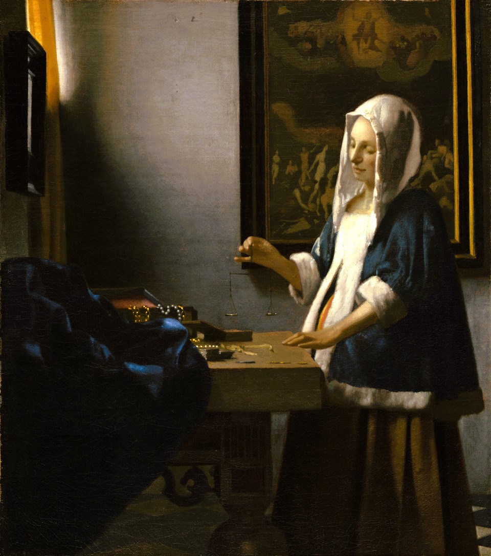 Con la solita e nota grazia, l’eccellente Vermeer porta in scena una figura femminile nella sua quotidianità domestica. Ma porta con sé soprattutto una domanda, che pare enigmaticamente fuoriuscire dall’opera. La donna infatti è colta nell’atto di soppesare delle perle, o dei monili d’oro, esposta ad un tenue taglio di luce, che le rischiara il volto sereno. Sullo sfondo una tela ha per soggetto il Giudizio universale: la figura regale di Cristo impera proprio sopra il capo della ricca signora. Siamo colti dalla bellezza dell’opera, dalla maestria dello stile vermeeriano, ma la magia della pittura di Vermeer riposa tutta nella sua capacità di creare enigmi dalle scene più familiari e ordinarie, senza far leva su alcun indizio simbolico, bensì con il solo uso degli sguardi, del colore e della composizione.