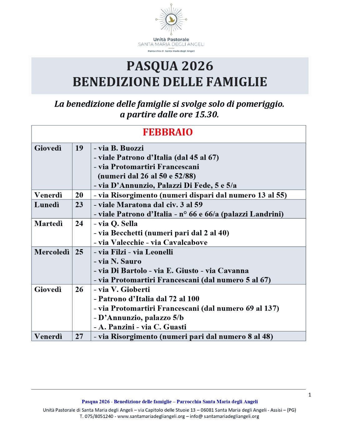 Pubblichiamo il calendario con i dettagli delle vie e delle zone oggetto della benedizione nella Parrocchia di Santa Maria degli Angeli.