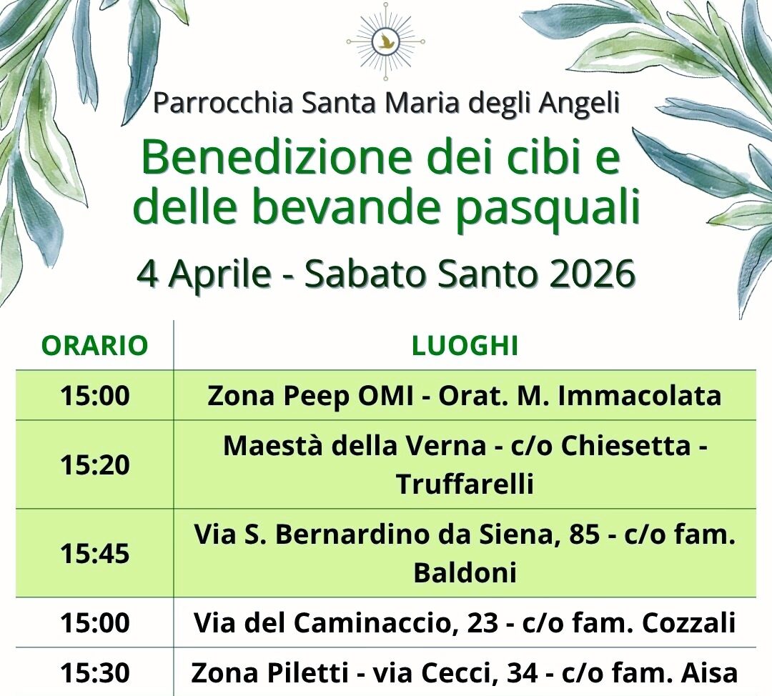 𝐒𝐚𝐛𝐚𝐭𝐨 𝐒𝐚𝐧𝐭𝐨, 𝟒 𝐚𝐩𝐫𝐢𝐥𝐞 𝟐𝟎𝟐𝟔, 𝐝𝐚𝐥𝐥𝐞 𝟏𝟓:𝟎𝟎 𝐚𝐥𝐥𝐞 𝟏𝟖:𝟎𝟎, in vari luoghi della nostra comunità, verranno 𝐛𝐞𝐧𝐞𝐝𝐞𝐭𝐭𝐢 𝐢 𝐜𝐢𝐛𝐢 che porteremo sulle nostre tavole di Pasqua. Consulta gli orari sulla locandina