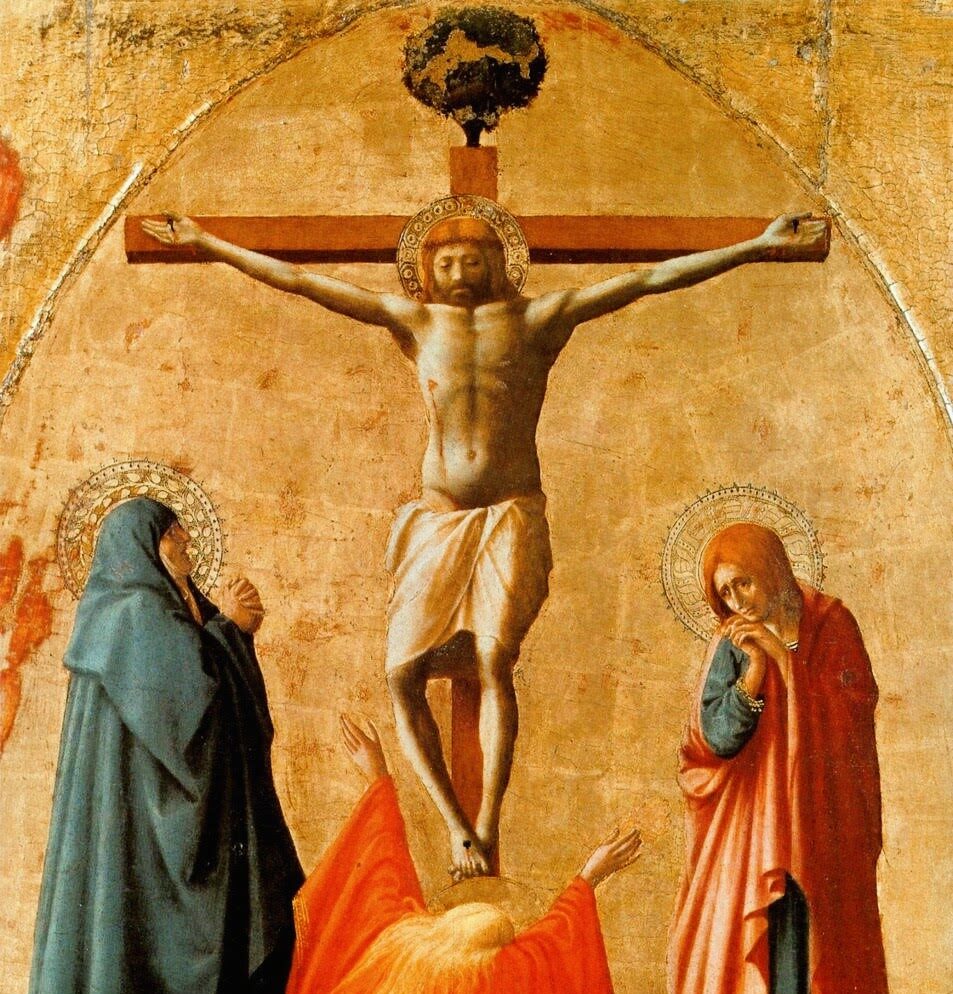 Una scena statica e drammatica. La dolente Vergine e l’affranto Giovanni stanno ai piedi della croce in straziante preghiera e partecipazione di fede. Masaccio sembra come fotografare l’attimo dell’ultimo respiro