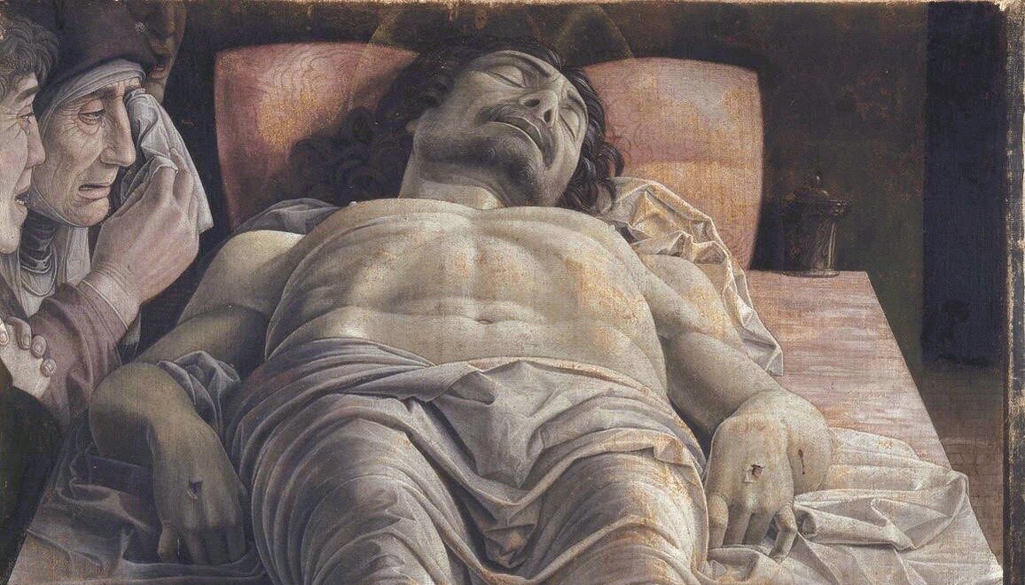 Nessun artista ha saputo immergerci tanto nella morte come Andrea Mantegna. Con una forzatura alla coerenza prospettica e in un’atmosfera algida e cinerea, siamo da lui calati claustrofobicamente nell’angosciosa profondità