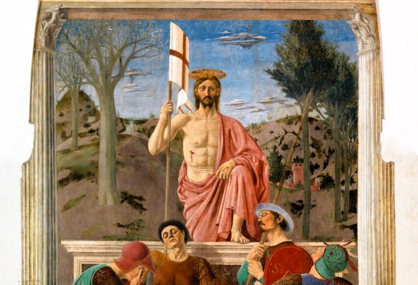 Tutta la grandezza di Piero della Francesca si concentra in questa celeberrima opera. Il maestro aretino rappresenta, tra dormienti gendarmi, uno statuario e regale Cristo che, erompendo dal sepolcro, si