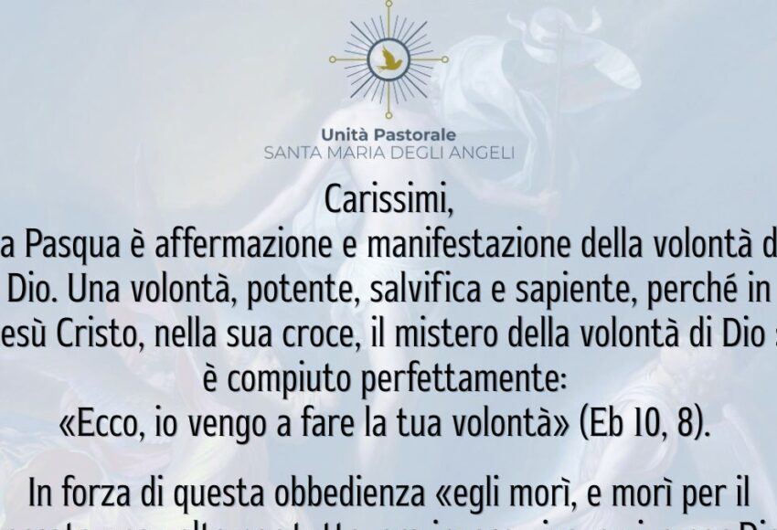 Carissimi,la Pasqua è affermazione e manifestazione della volontà di Dio. Una volontà, potente, salvifica e sapiente, perché in Gesù Cristo, nella sua croce, il mistero della volontà di Dio si
