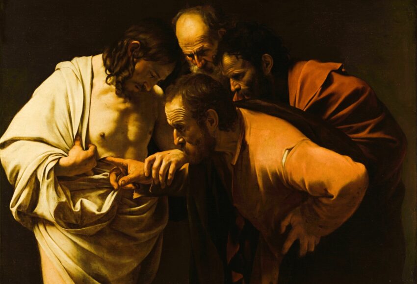 Forse il più celebre tra i dipinti di Caravaggio, l’Incredulità di Tommaso intende trascinarci a contemplare la profondità della carne del Figlio di Dio, liberata dalla corruzione della morte. Gli