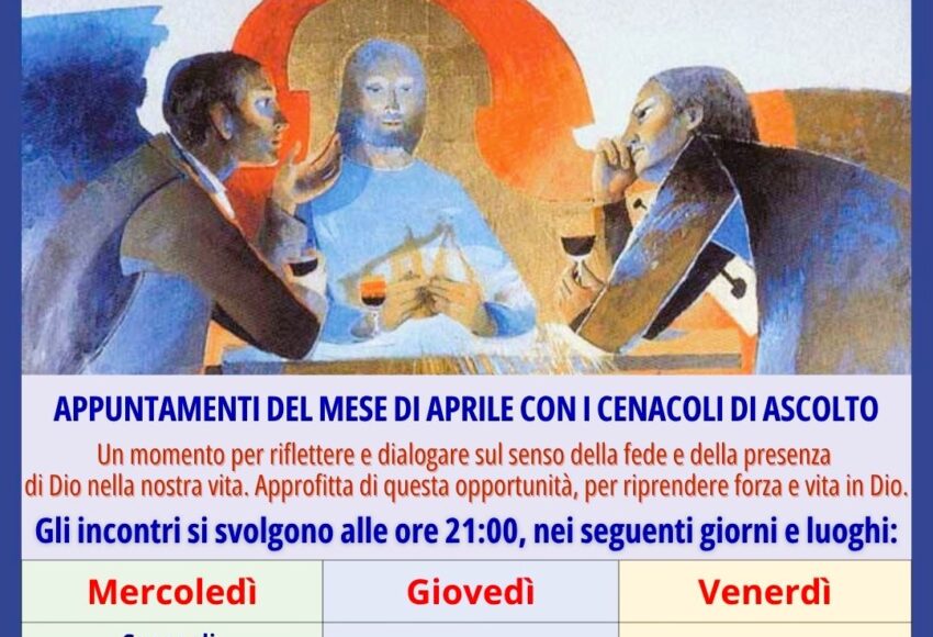Mercoledì 15 aprile, alle 𝐨𝐫𝐞 𝟐𝟏, torna il l’𝐚𝐩𝐩𝐮𝐧𝐭𝐚𝐦𝐞𝐧𝐭𝐨 con i 𝐂𝐞𝐧𝐚𝐜𝐨𝐥𝐢 𝐝𝐢 𝐚𝐬𝐜𝐨𝐥𝐭𝐨, diffusi in diversi luoghi della parrocchia. 𝐃𝐚𝐭𝐞 𝐞 𝐥𝐮𝐨𝐠𝐡𝐢 𝐝𝐞𝐠𝐥𝐢 𝐢𝐧𝐜𝐨𝐧𝐭𝐫𝐢: Mercoledì 15 aprile – Suore