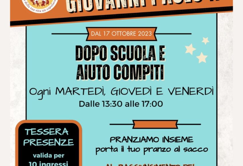 Anche quest’anno inizia il servizio del dopo scuola in Oratorio! Ogni martedì, giovedì e venerdì, a partire dal 17 ottobre, i bambini e i ragazzi possono venire in oratorio per