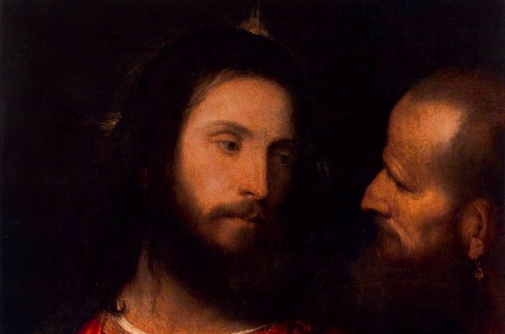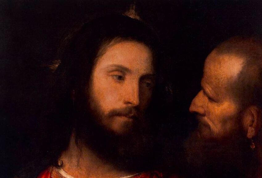 Diversamente da ciò che spesso viene detto circa questa nota tela di Tiziano, essa raffigura non l’episodio del ritrovamento della moneta da parte di Pietro, ma il quesito rivolto a